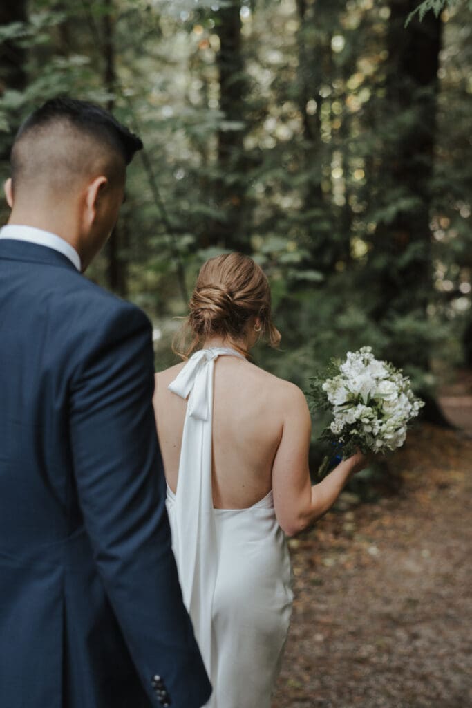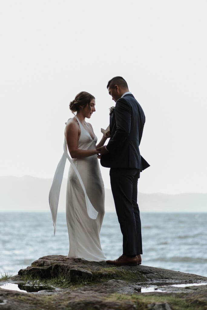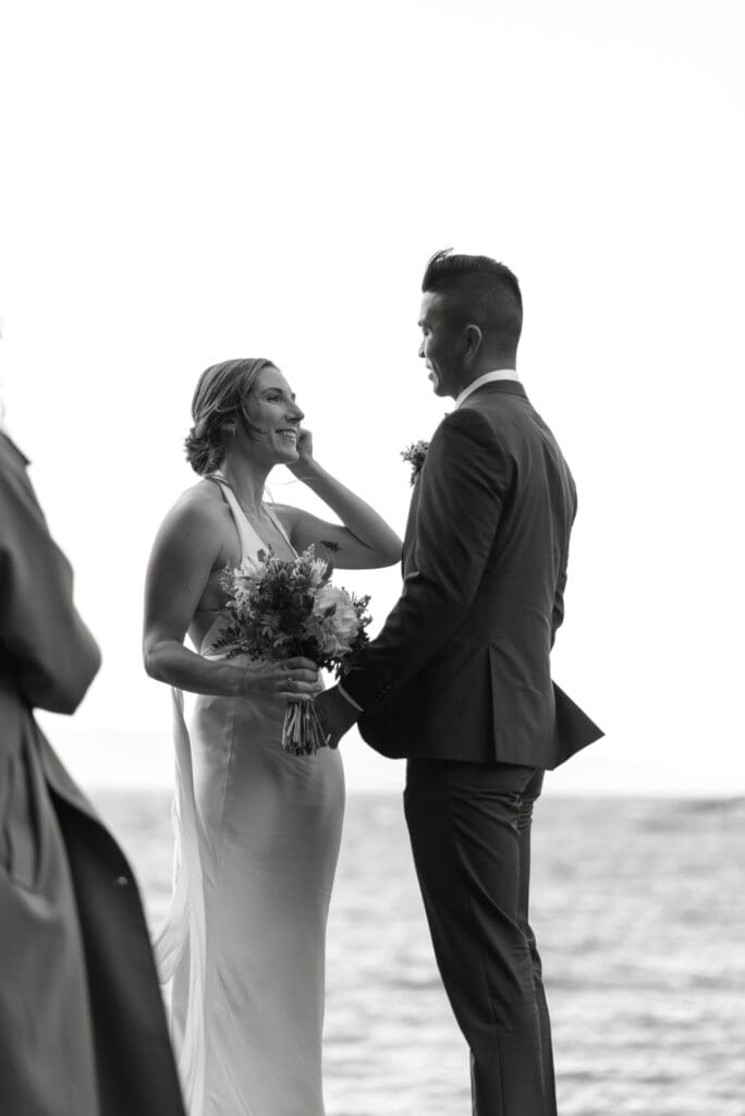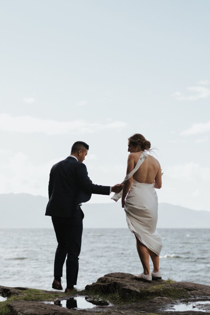 After the ceremony, we just wandered. No big announcement that portraits were starting, no dramatic shift in tone. They were already married, already relaxed, already laughing a little differently than they were an hour earlier. I’ll nudge us toward better light or a stretch of coastline that feels open, but mostly I’m just walking with them while they settle into it. That in-between space right after the vows is always my favorite: it’s softer, less guarded, and it doesn’t need much from me at all.